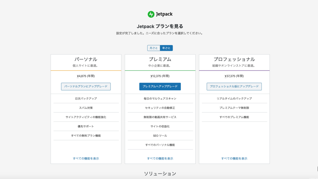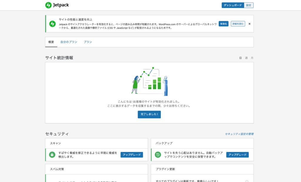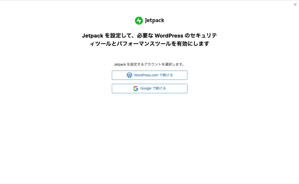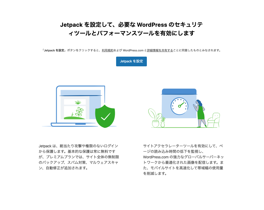有効化の後、下記のような画面が表示されるので「Jetpackの設定」をクリックします。