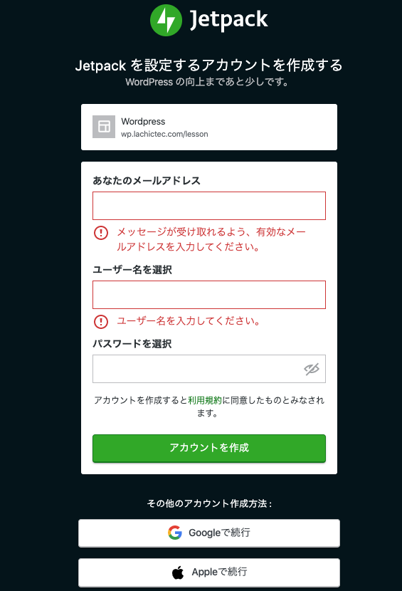 WordPress.comのアカウントを持っていない場合は、下記の画面で新規アカウントを作成します。アカウントを既に持っている方は、ログインをします。