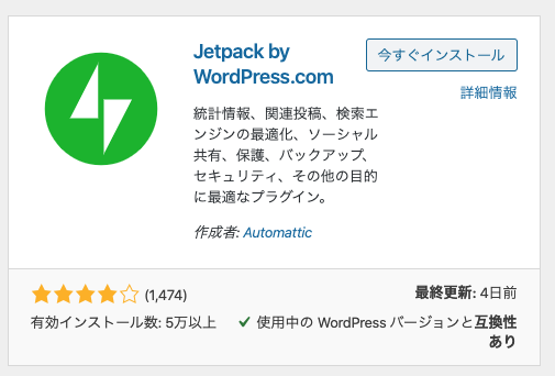 ナビゲーションメニューの「プラグイン>新規追加」で「Jetpack」を検索。