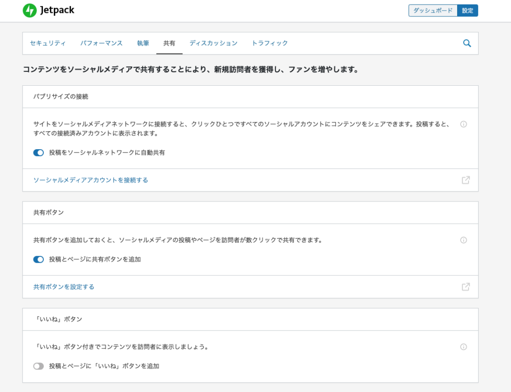 共有したい記事を選び、右上にJetpackの緑のアイコンがをクリックすると以下の画面が表示されます。