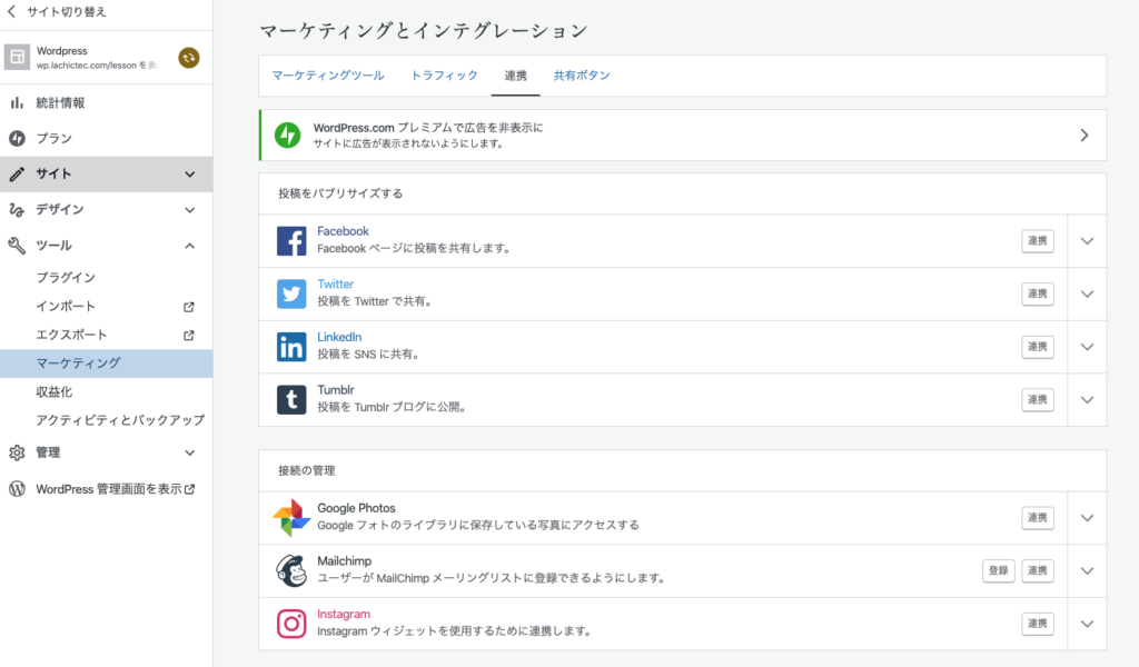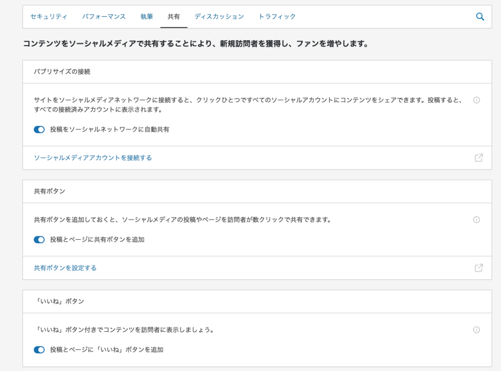 先ほどのソーシャルメディアの連携の際に設定したページにある、「共有ボタン」の「投稿とページに共有ボタンを追加」をクリックすると、記事内に連携したいSNSのボタンが表示されます。