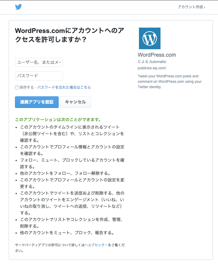 Twitter,Facebookそれぞれにある連携ボタンをクリックすると、それぞれ以下のように「連携アプリを認証する」画面が現れるので、連携させたいアカウントのパスワードとユーザ名で連携させます。