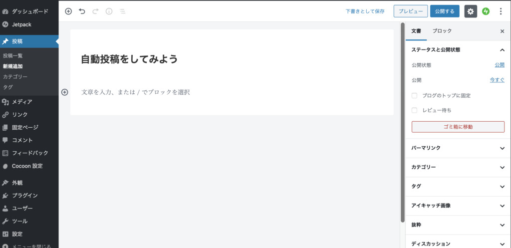 WordPressにはプラグインという機能があり、それらをインストールすることによって、さまざまな機能をWordpressに加えることができます。自動投稿をするプラグインも複数あります。今回はその中で「Jetpack」を入れていきます。