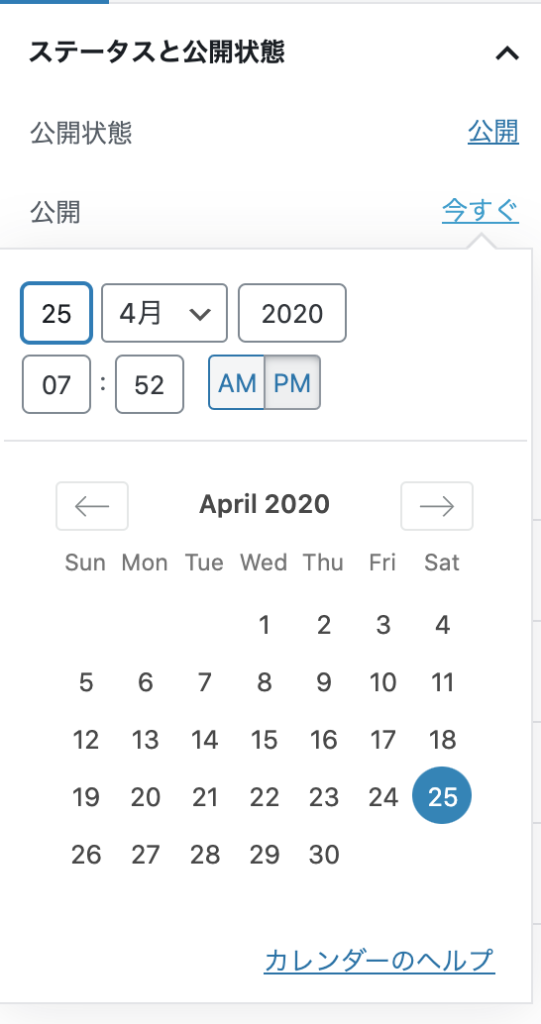 「公開」の「今すぐ」をクリックすると、詳細な日時を指定できる箇所とカレンダーが表示されます。ここで自分が記事を公開したい日時を選ぶことができます。