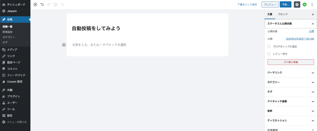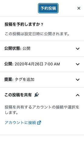 選んだ状態の記事作成画面がこちらです。上の青いボタンが「公開」ボタンから「予約投稿」ボタンに変わります。